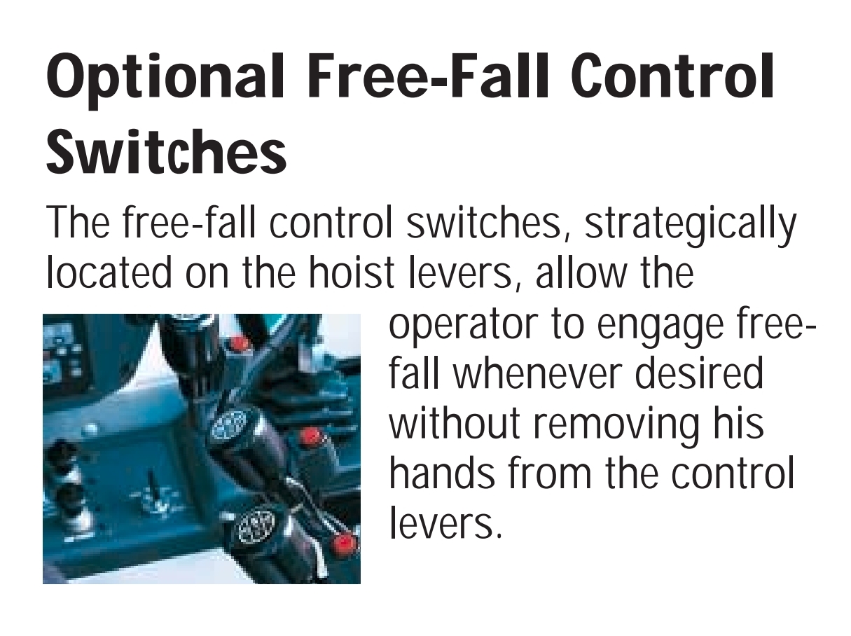 일부 이동식 크레인의 호이스트 윈치에는 자유 낙하 기능이 있어 후크와 화물이 통제되지 않은 방식으로 중력에 의해 떨어질 수 있습니다. 이 기능은 전통적으로 클램쉘 준설 및 동적 압축과 같은 활동을 위해 크레인에 제공되었습니다. 그러나 의도하지 않은 자유 낙하 기능의 활성화와 관련된 위험이 높을 수 있으며 제공이 거의 필요하지 않습니다. 대부분의 모바일 크레인 제조업체는 새 크레인에 이 기능을 제공하지 않습니다. 화물 낙하로 인한 근로자의 위험과 크레인 및 크레인 운전자의 잠재적 손상이 너무 커서 표준 산업 관행으로 크레인에 대한 자유 낙하를 계속 허용할 수 없습니다.