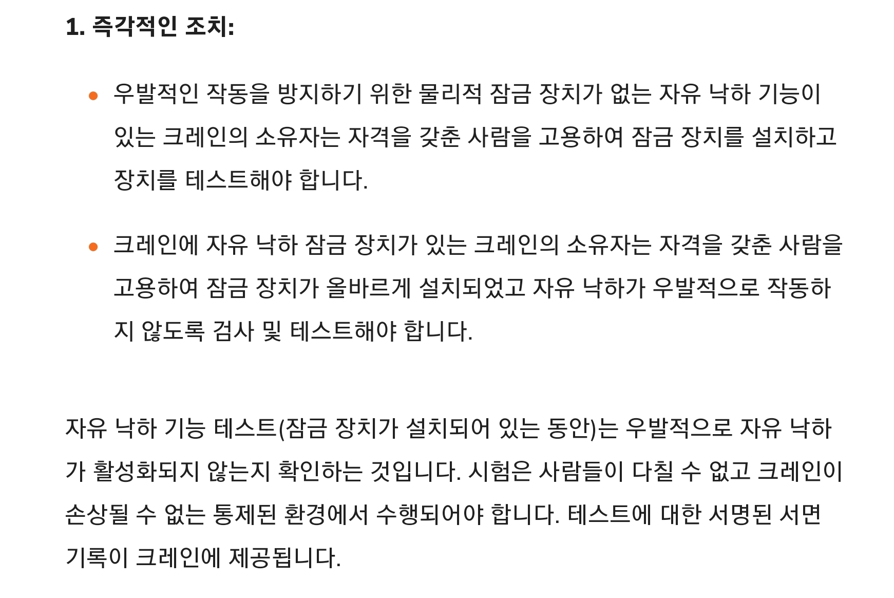우발적인 작동을 방지하기 위한 물리적 잠금 장치가 없는 자유 낙하 기능이 있는 크레인의 소유자는 자격을 갖춘 사람을 고용하여 잠금 장치를 설치하고 장치를 테스트해야 합니다.