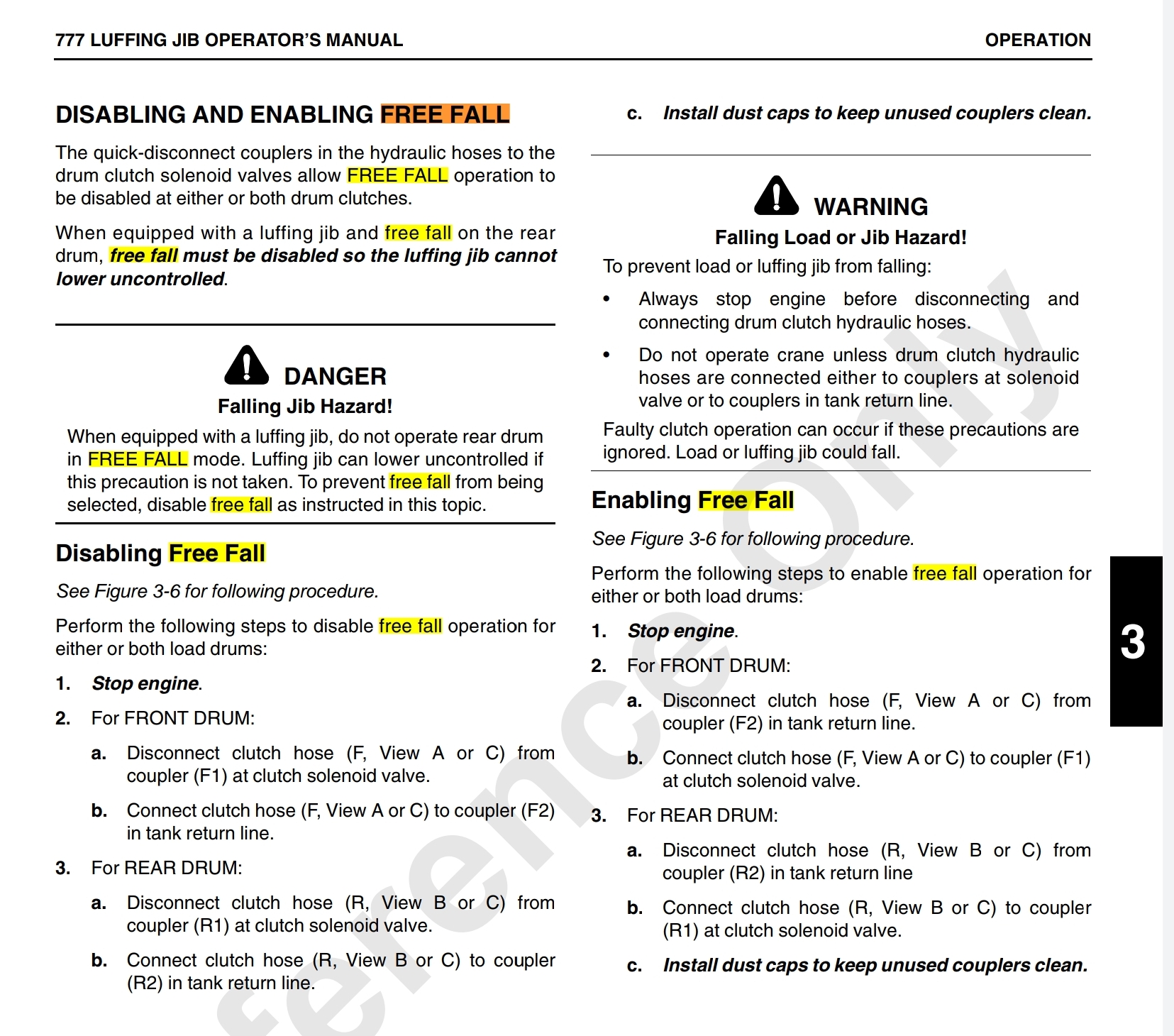 자유 낙하 기능이 있는 크레인의 소유자는 이러한 유형의 작업에 대한 대안이 없는 한 자유 낙하 시설을 영구적으로 비활성화하는 것을 고려해야 합니다. 이 상황에 대해 문서화된 위험 평가를 준비해야 합니다. 이러한 자유 낙하 비활성화에는 크레인의 자유 낙하 스위치 제거와 자유 낙하 기능이 영구적으로 제거되었음을 나타내는 크레인 제조업체 또는 유능한 사람(가급적 전문 엔지니어)의 인증서가 포함되어야 합니다.
