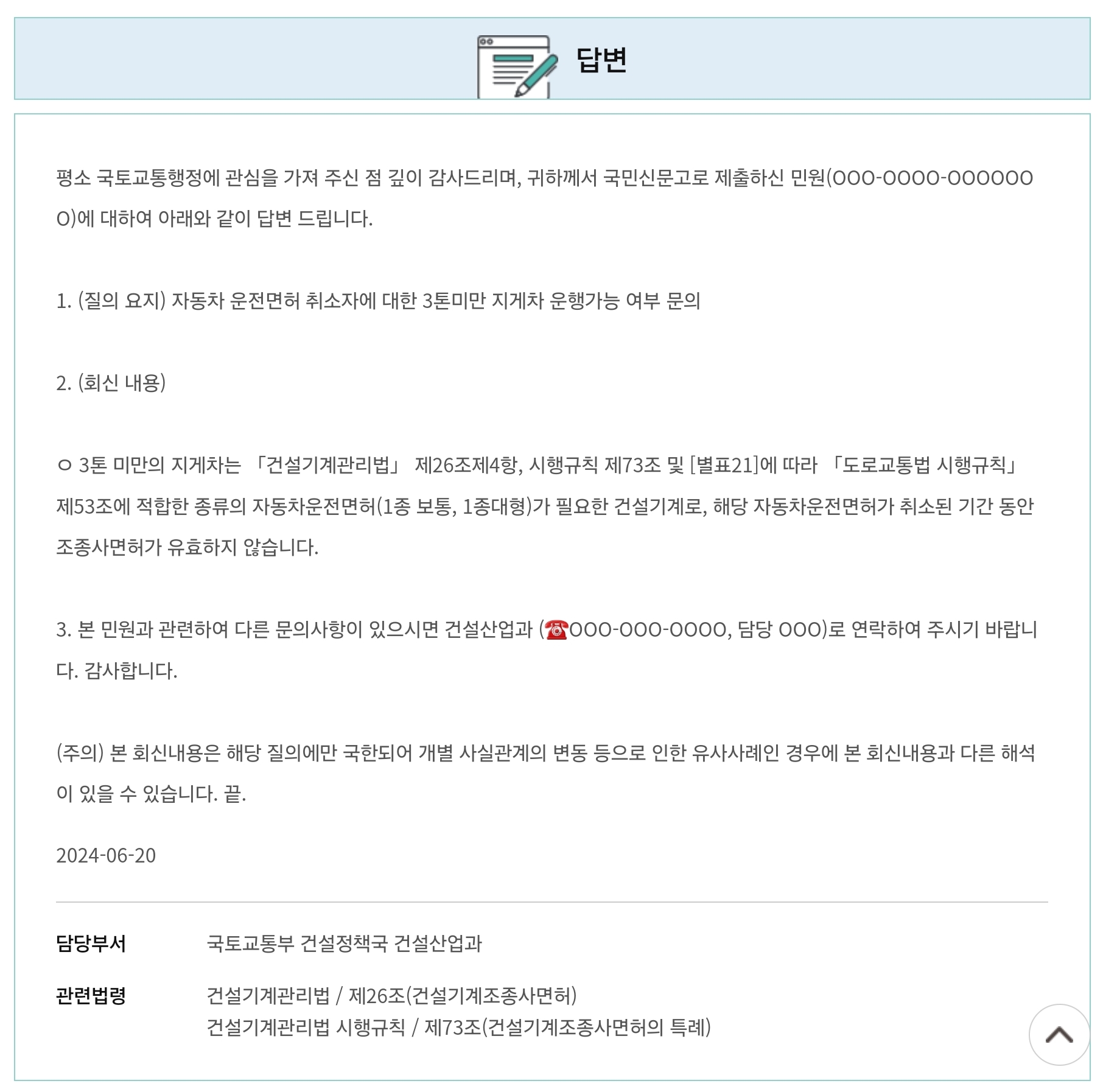 [질의회신] 240620 3톤미만 지게차 면허 취득 후 1종운전면허증 취소시 건설기계조종사 면허증 유지 문의건설장비 관련자료/질의회신 2024. 8. 16. 00:41728x90반응형