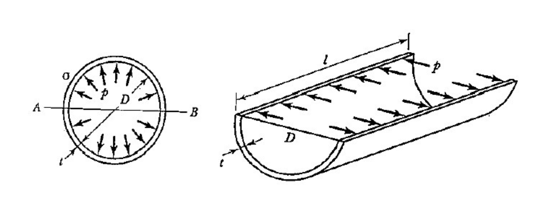 3. 그림과 같은 원통형 압력용기에서 원주방향의 응력(σt), 축방향응력(σz) 및 동판의 두께(t)를 계산하는 식에 대하여 설명하시오.