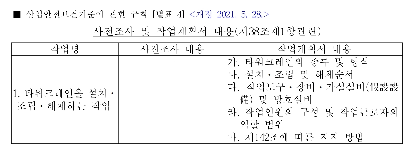 그 계획에 따라 작업을 하도록 하여야 한다.[별표 4] 사전조사 및 작업계획서 내용(제38조제1항관련).pdf0.19MB1. 타워크레인을 설치ㆍ조립ㆍ해체하는 작업