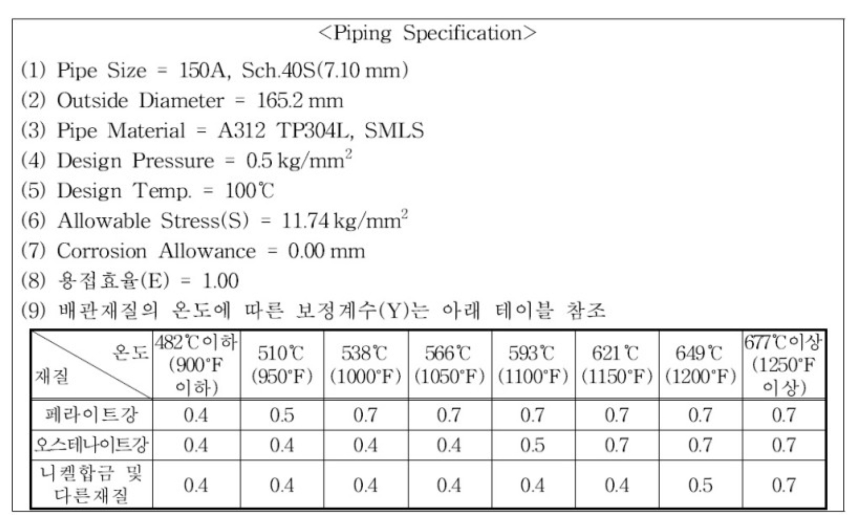 6. 공정 내 독성물질을 저장하는 탱크에서 반응기로 이송하는 배관이 아래와 같은 조건에서 설계, 시공, 운전되어 8년간 사용 중에 있으며 두께측정 결과 5.35 mm를 나타내고있다. ANSI/ASME B31.3 Code를 적용하여 동 배관에 대해