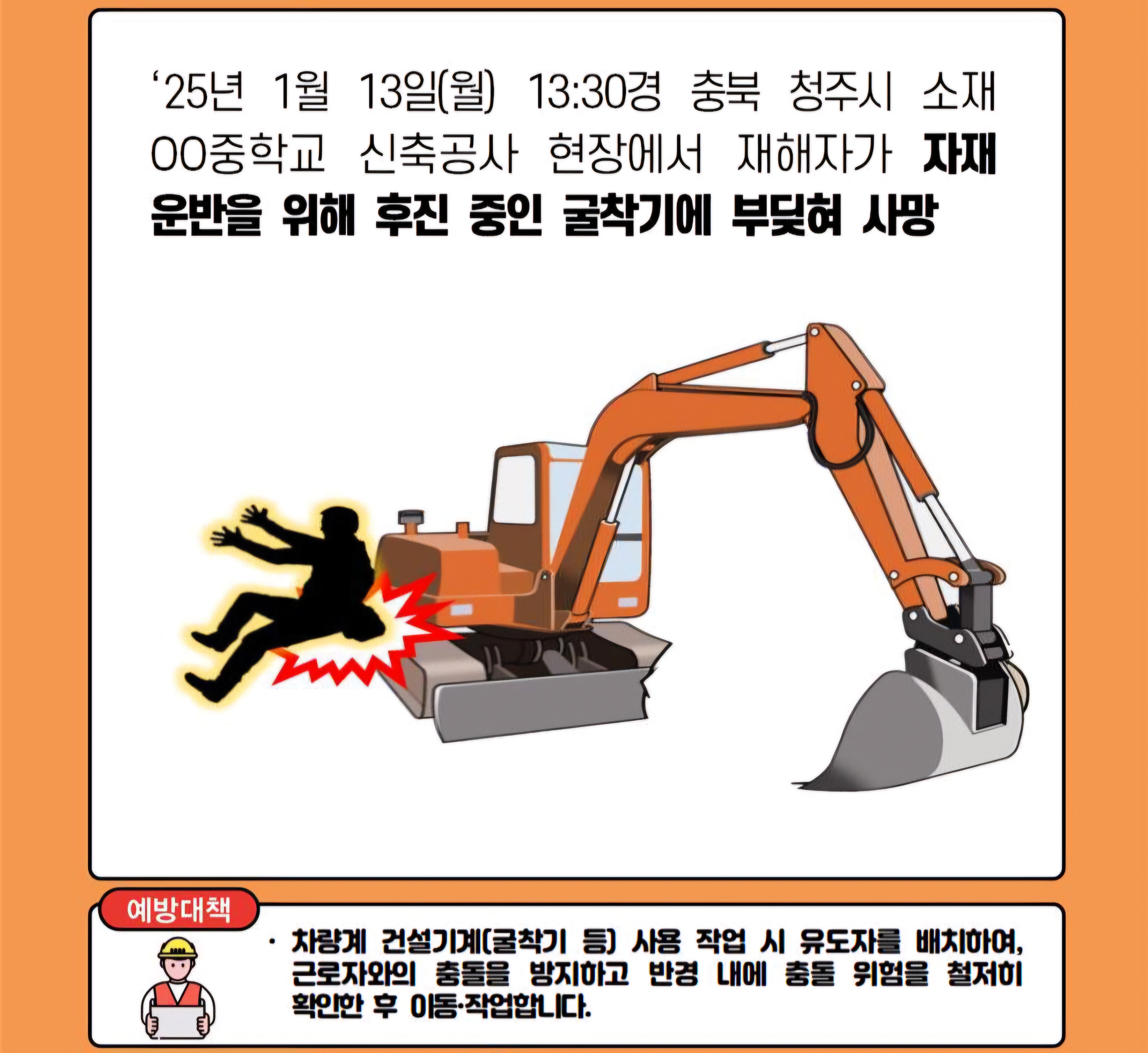 ○ 사고경위 : 중학교 정문 출입구에 도로 경계석을 설치하던 60대 일용직 노동자가 자재 운반을 위해 후진 중인 굴착기에 부딪혀 사망