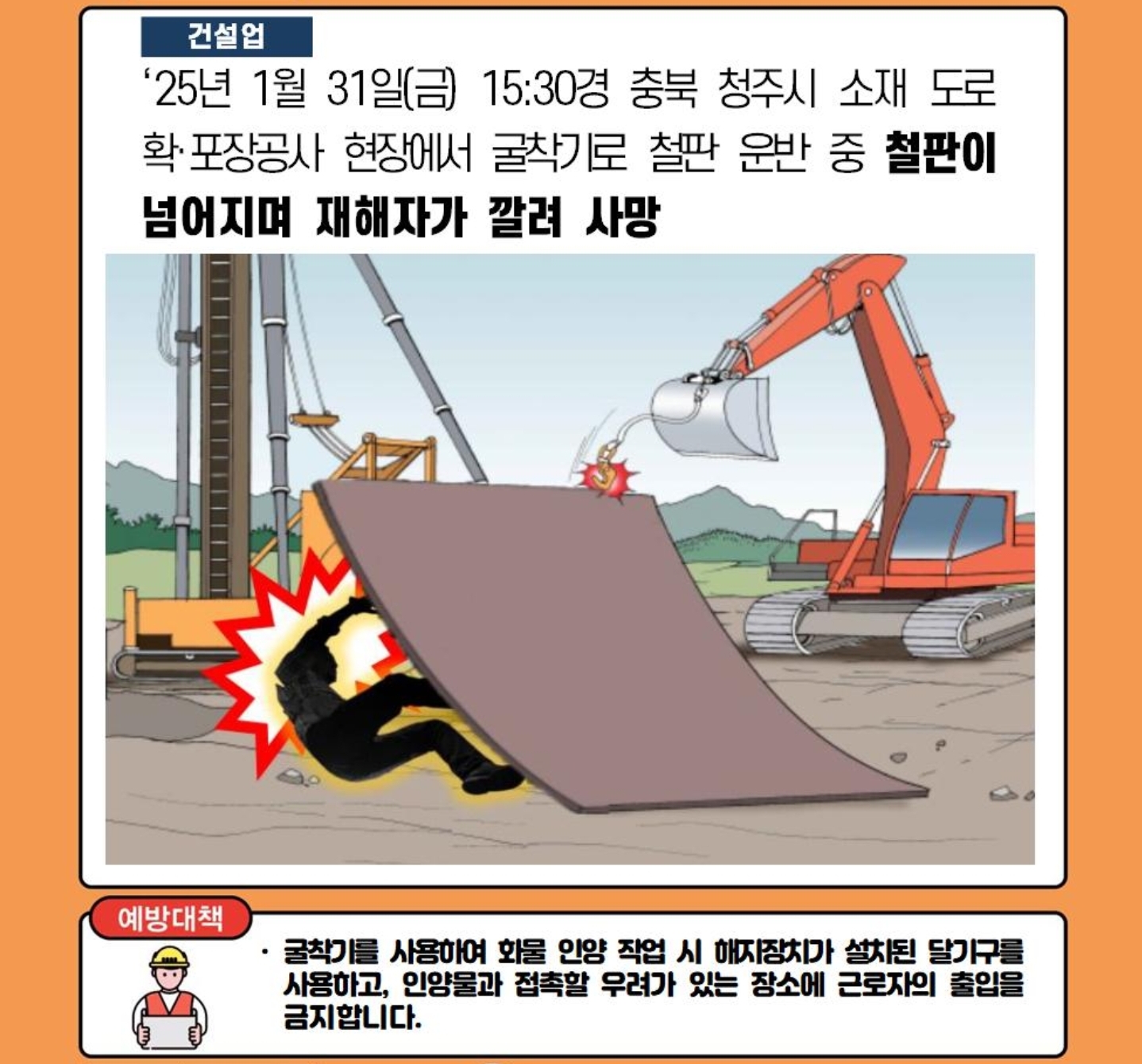 ○ 사고경위 : 충북 청주시 소재 도로 확·포장공사 현장에서 굴착기로 철판 운반 중 3t 무게의 철판이 넘어지며 재해자가 깔려 사망