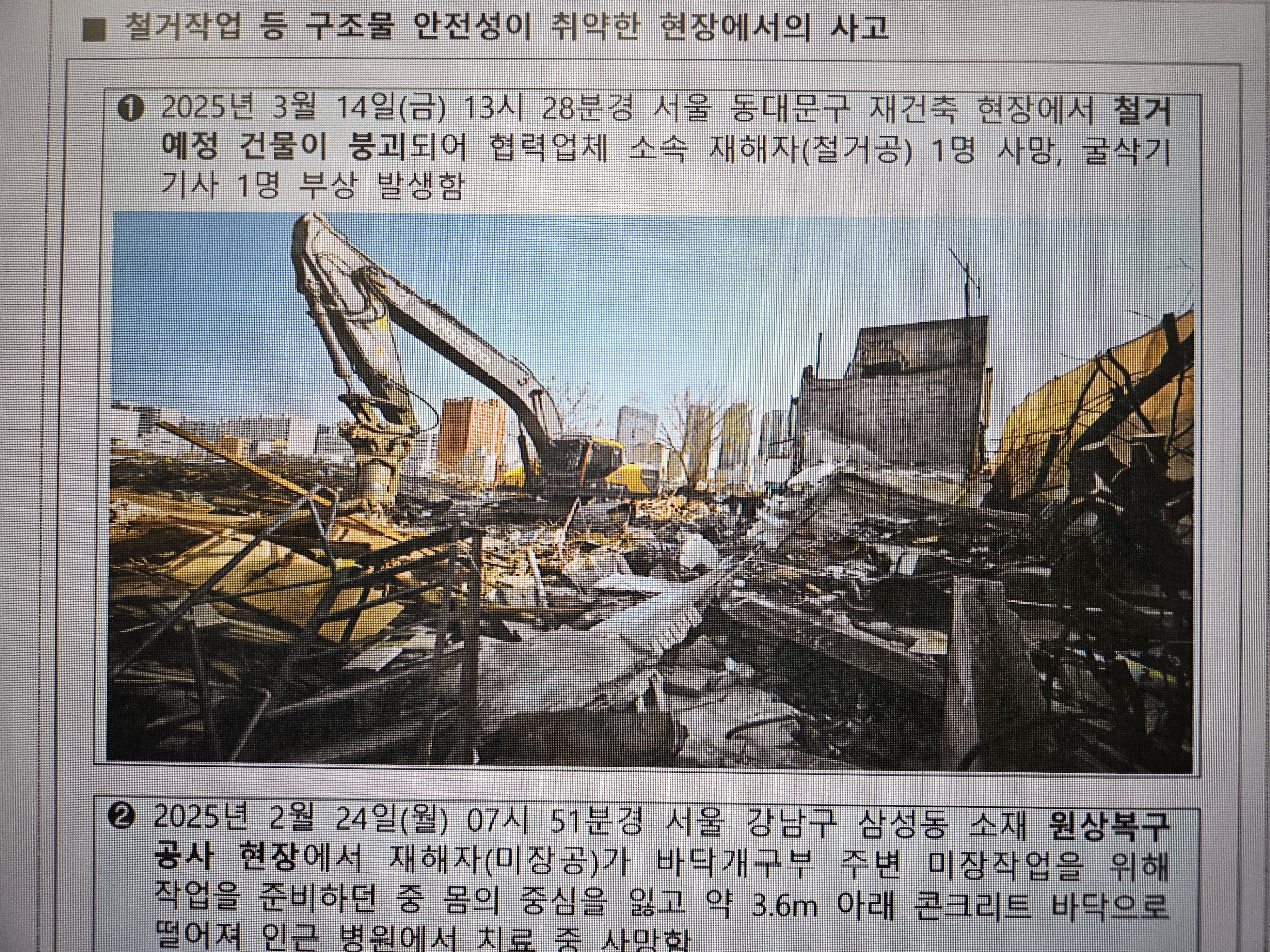 ○ 사고경위 : 재개발 현장 철거 작업이 진행 중으로 건물 상태를 점검하던 중 2층 건물의 외벽이 무너져 50대 근로자가 매몰돼 심정지 상태로 병원으로 이송되었으나 사망, 함께 있던 굴착기 운전원 1명도 다리 다치는 경상