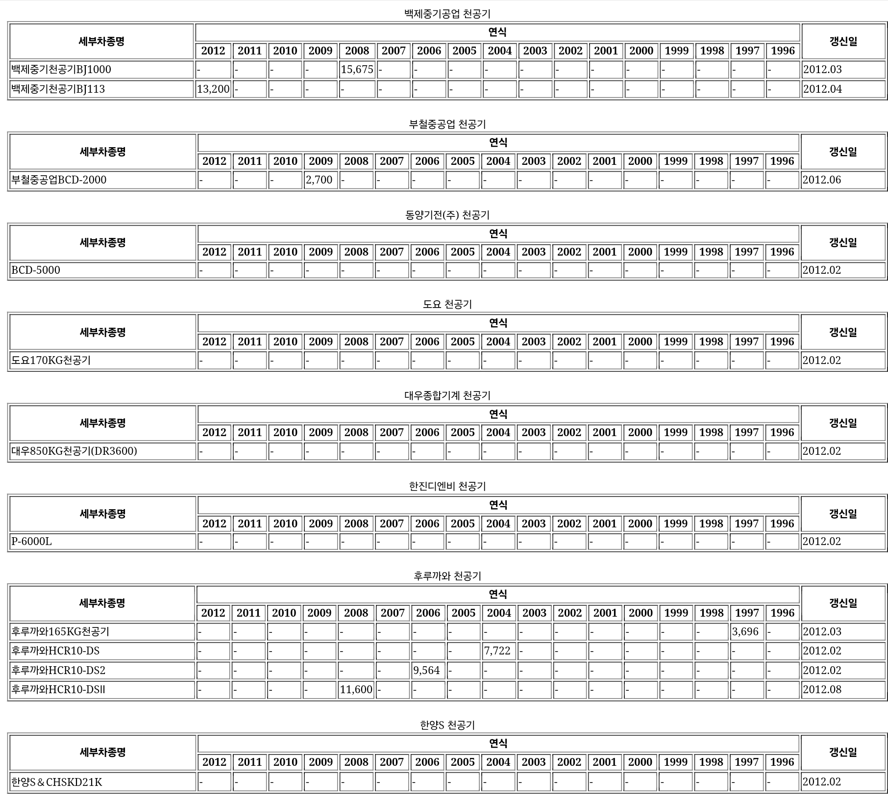 백제중공업 : BJ-1100, BJ1200-3, BJ1200-8, BJ7800, BJ7900, BJP250, RY-1000
