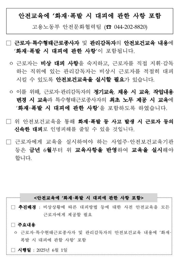 [개정법규] 240909_FAQ 밀폐공간 산소 및 유해가스 농도측정 (0) 2025.08.09 [보도자료] 250723 고용노동부 장관 "안전한 일터 프로젝트" 본격 착수, 중대재해 근절을 위해 총력 (0) 2025.08.06 [교육자료] 250619 업종별 안전보건관리체계 구축 가이드(28종) (12) 2025.07.25 [교육자료] 250601 2025년 안전보건교육 안내서 (4) 2025.07.25 [교육자료] 중대재해처벌법 해설 - 중대시민재해(시설물·공중교통수단) (11) 2025.07.20
