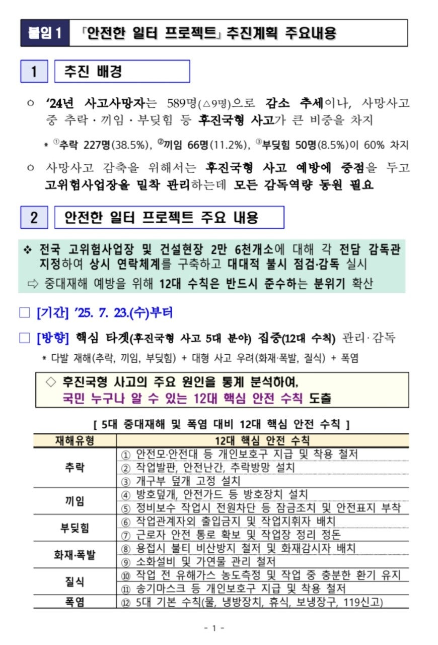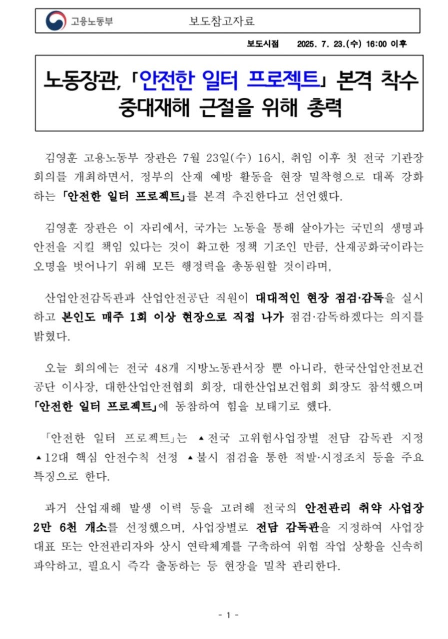 [보도자료] 250723 고용노동부 장관 "안전한 일터 프로젝트" 본격 착수, 중대재해 근절을 위해 총력건설장비 관련자료/산업안전보건법 2025. 8. 6. 07:58728x90반응형728x90반응형