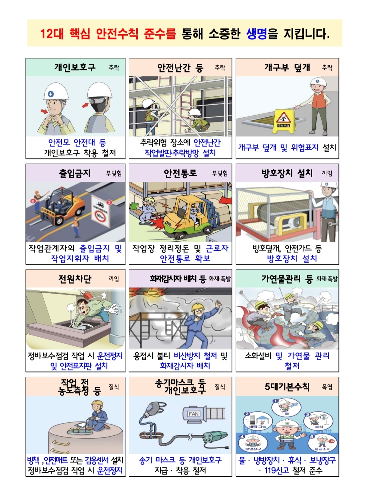 [회의자료] 250814 경제관계장관회의, 지방중심 건설투자 보강방안 (16) 2025.08.16 [회의자료] 250814 중대재해 근절을 위한 건설사 간담회 (고용노동부) (12) 2025.08.16 [개정법규] 240909_FAQ 밀폐공간 산소 및 유해가스 농도측정 (0) 2025.08.09 [보도자료] 250723 고용노동부 장관 "안전한 일터 프로젝트" 본격 착수, 중대재해 근절을 위해 총력 (0) 2025.08.06 [보도자료] 250701 2025년 하반기부터 이렇게 달라집니다(고용노동부) (2) 2025.08.06