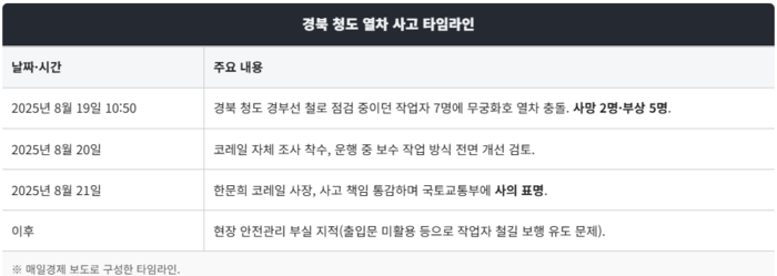 ○ 피해현황 : 2명 사망, 4명 중상, 1명 경상 (코레일 1명 (29세), 외부업체 6명)