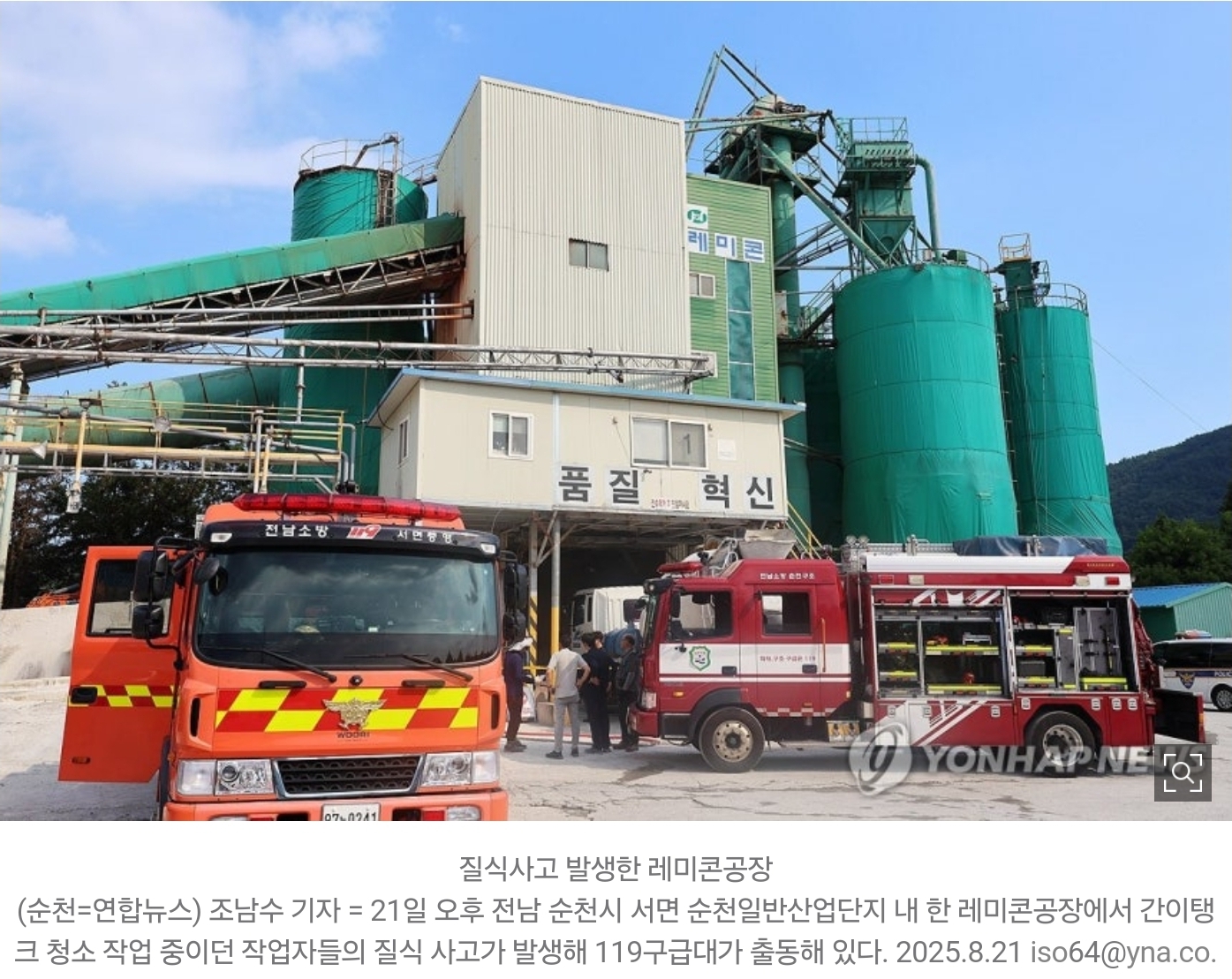 전남 순천 레미콘 공장 가스 중독 추정 사고 부상자 3명 가운데 2명이 숨졌다. 전남소방본부의 말을 종합하면 21일 오후 1시29분쯤 순천시 한 레미콘 공장 내 저장용간이탱크 안에서 청소 작업 중