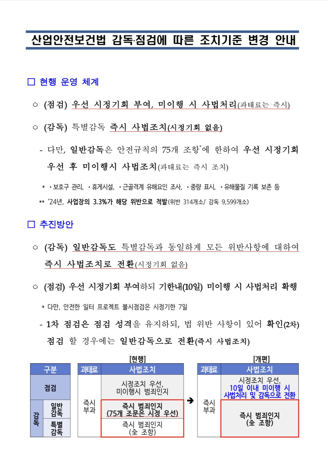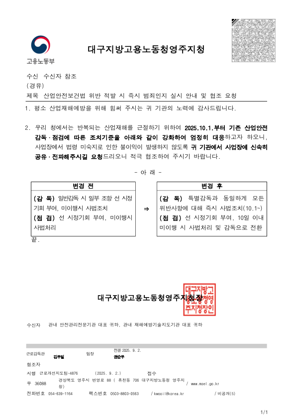 산업안전보건법 감독·점검에 따른 조치기준 변경 안내