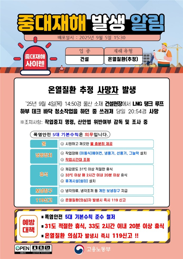 ○ 사고경위 : 25.9.4.(월) 14:50경 울산 남구 신항로716번길 126(황성동) 소재 「울산 북항 액화가스 및 석유제품 터미널 3단계 LNG 현장에서 신축 공사 중이던 LNG 탱크 루프 하부 데크 구간에서 데크 바닥 청소작업을 하던 재해자가 갑자기 쓰러져 동료 작업자가 119 신고하였고, 울산대학병원으로 후송되었으나, 20:54분경 사망하였음.