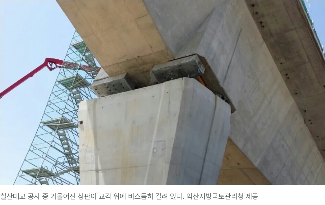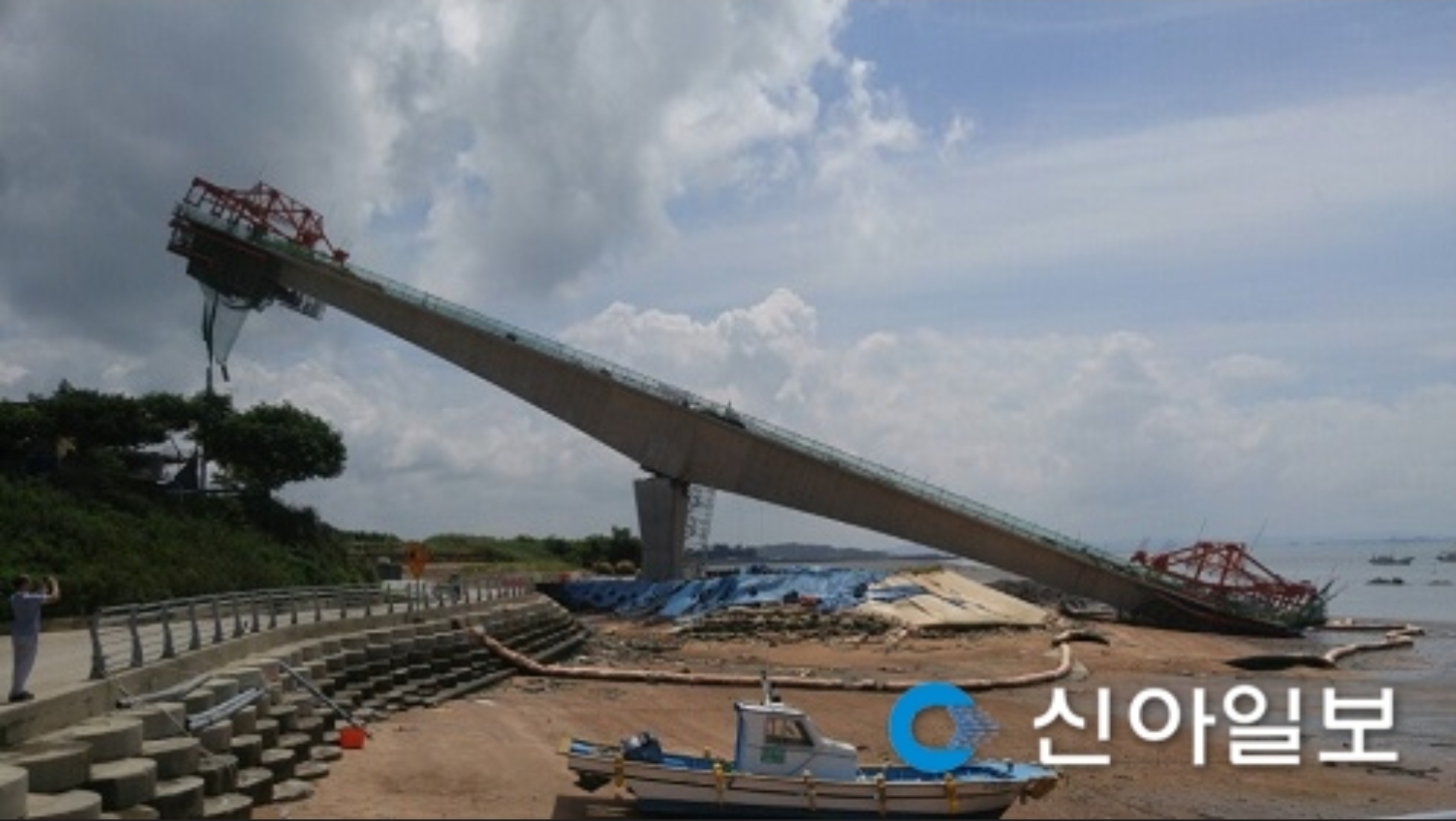 경찰 및 소방당국에 따르면 8일 오전 10시57분께 전남 영광군 염산면에 위치한 칠산대교 공사 현장에서 14번째 교량이 교각을 가운데 두고 한 쪽이 바다 쪽으로 기울어지는 사고가 발생했다.