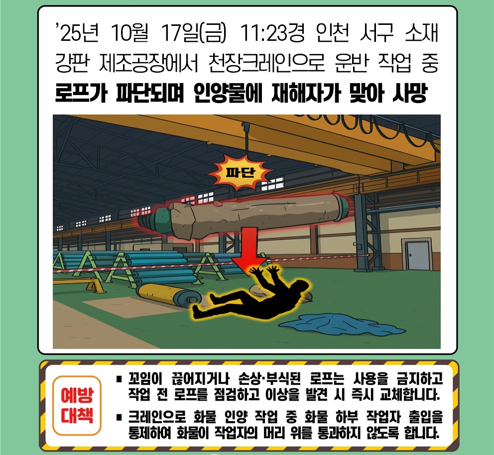 [사고사례] 251017 인천서구 케이지스틸 인천공장, 크레인 줄걸이 파단으로 작업자 깔려 사망건설장비 사고사례/천장주행 갠트리 크레인 사고사례 2025. 10. 19. 00:44728x90반응형