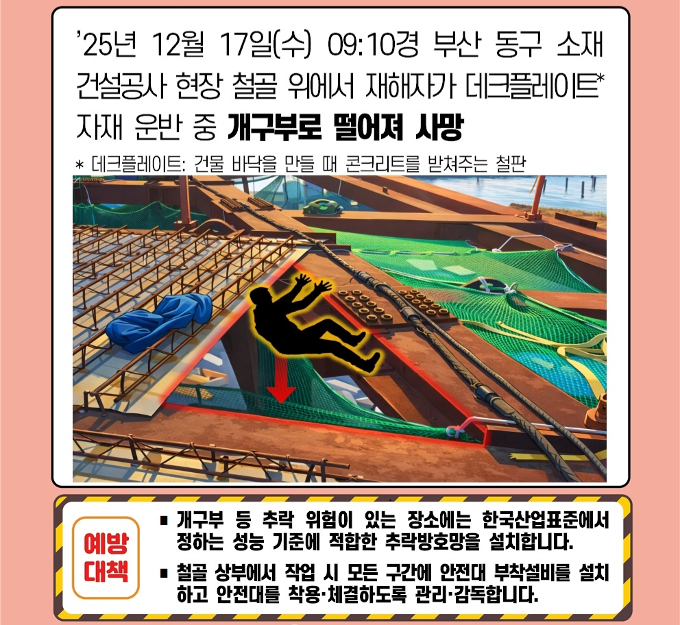 ○ 사고경위 : 부산 동구 소재 건설공사 현장 철골 위에서 재해자가 데크플레이트 판개 작업을 위해 자재를 운반하던 중 개구부로 추락하여 (약20m) 사망