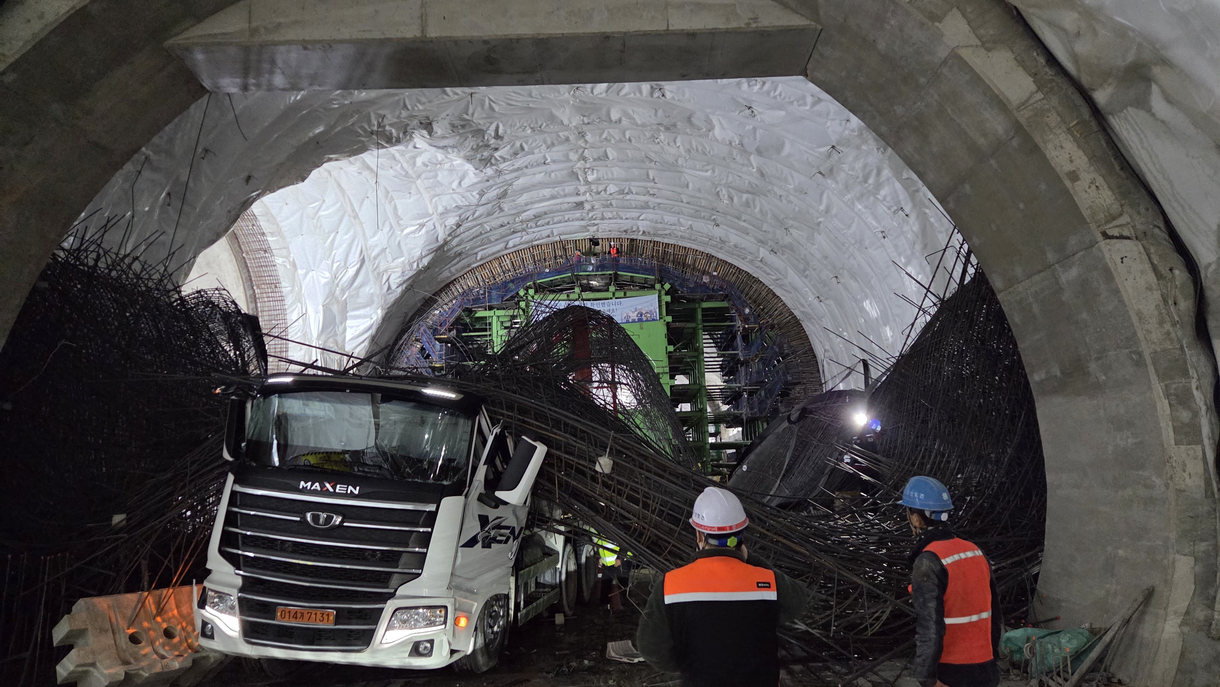 ※ 라이닝 공사는 굴착된 터널 내부에 철근과 콘크리트를 시공해 최종 내벽을 형성하고 구조를 안정화하는 과정으로, 거푸집 설치 전까지는 철근망이 자체 하중과 앵커 등 고정장치에 의존해 지지된다.