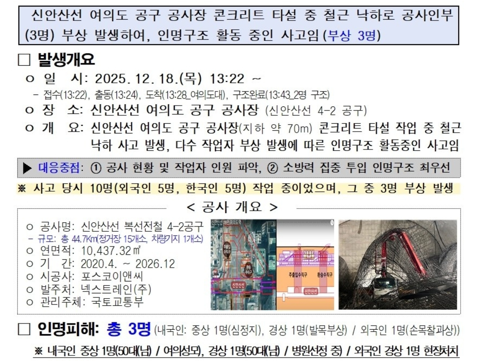 ○ 사고경위 : 신안산선 여의도 공구 공사장 지하 70m에서 지하정거장을 조성하기 위해 콘크리트 라이닝 공정 (터널 아치형 작업 구간)에서 콘크리트 펌프카로 터널 천장 타설 작업 중 터널 굴착부에 배근된 길이 30~40m, 두께 25∼29㎜의 철근망이 무너지면서 하부에 있던 콘크리트 펌프카를 덮쳐 운전중이던 재해자가 맞으며 머리를 다쳐 병원으로 옮겨 졌지만 사망