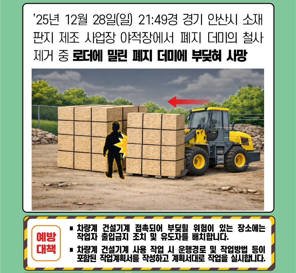 [사고사례] 251228 안산 단원구 종이상자 제조, 로더로 폐지 옮기는 작업 중 끼여 사망건설장비 사고사례/천장주행 갠트리 크레인 사고사례 2025. 12. 29. 22:22728x90반응형