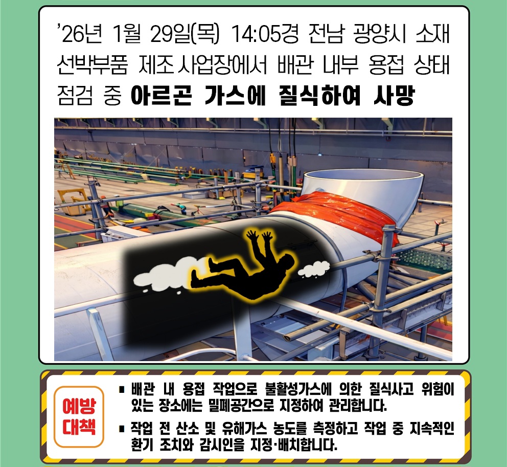 '26년 1월 29일(목) 4:05경 전남 광양시 광양읍 소재 선박부품 제조사업장에서 배관(600㎜파이프) 내부 용접 상태 점검 중 아르곤 가스에 질식하여 사망(남, 40대)