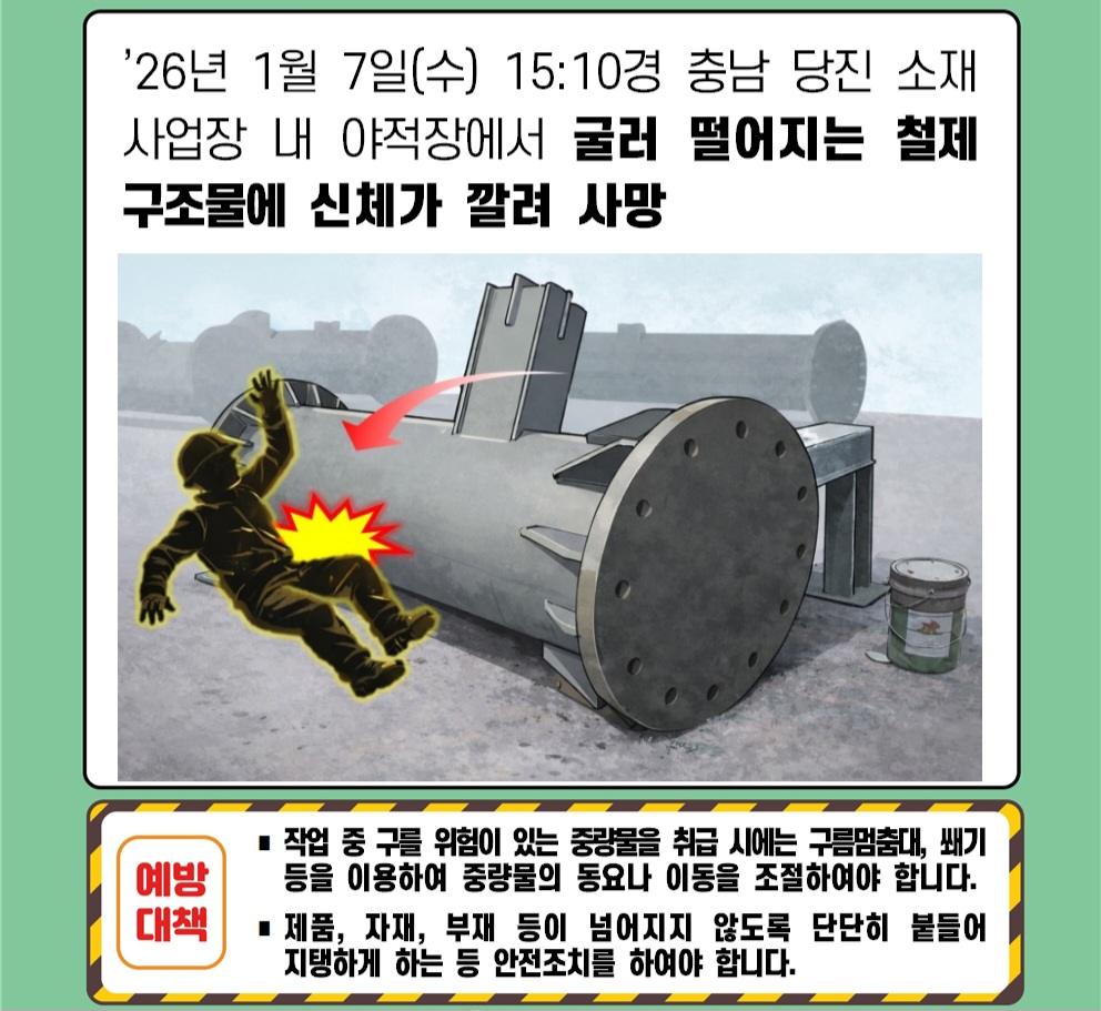 '26년 1월 7일(수) 15:10경 충남 당진 소재 사업장 내 야적장에서 굴러 떨어지는 철제 구조물에 신체가 깔려 사망