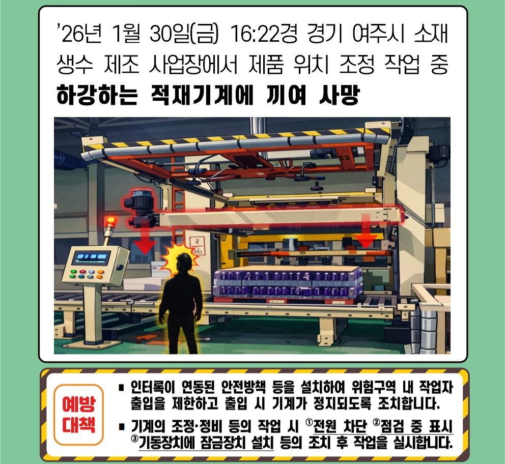 26년 1월 30일(금) 16:22경 경기 여주시 강천면 소재 생수 제조 사업장에서 페트병 포장 기계에서 컨베이어 벨트가 돌아가던 현장에서 상품 포장을 하던 60대 근로자가기계 철판이 하강하여 포장 작업중인 직원 머리가 포장기계에 끼여 사망1명(남, 60대)