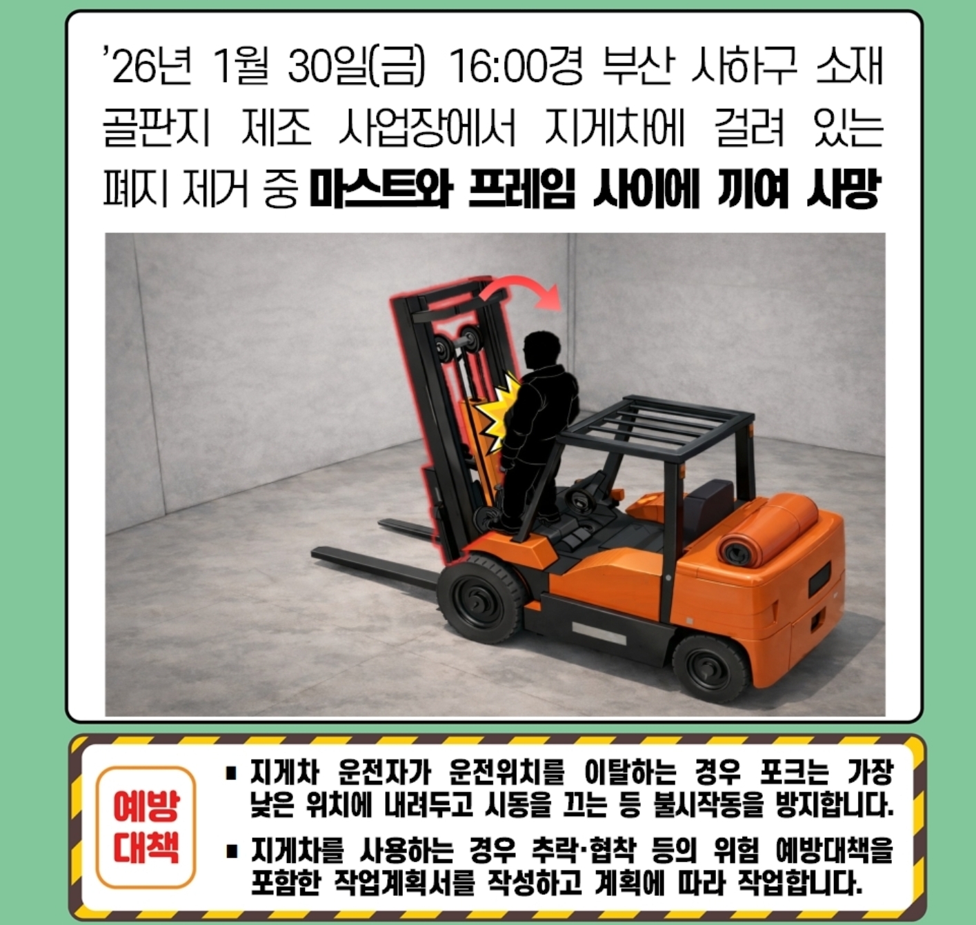 ○ 사고경위 : 부산 사하구 소재 골판지 제조 사업장에서 지게차에 걸려 있는 폐지 제거 중 백레스트와 운전석 프레임 사이에 끼여 사망