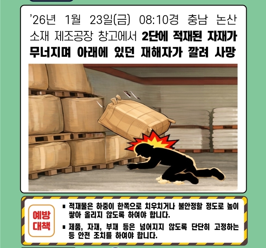 '26년 1월 23일(금) 08:10경 충남 논산 연산면 백석리의 한 비닐 원료 생산 제조공장 창고에서 포대 하차 작업을 하던 재해자가 하단의 터진 포대를 정리하다가 2단으로 적재돼 있던 비닐 원료 포대가 무너지며 떨어져 아래에 있던 60대 재해자가 포대(개당 500kg)에 깔려 심정지 상태로 발견돼 병원으로 이송됐으나 사망