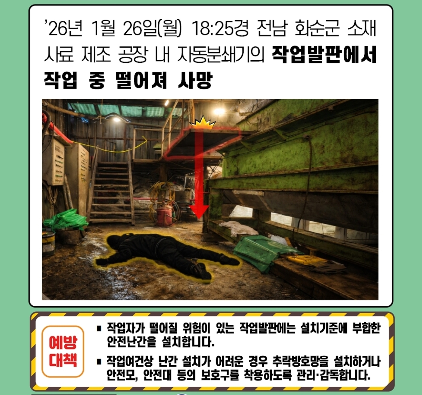 '26년 1월 26일(월) 18:25경 전남 화순군 소재 사료 제조 공장 내 자동분쇄기의 작업발판에서 작업 중 떨어져 사망