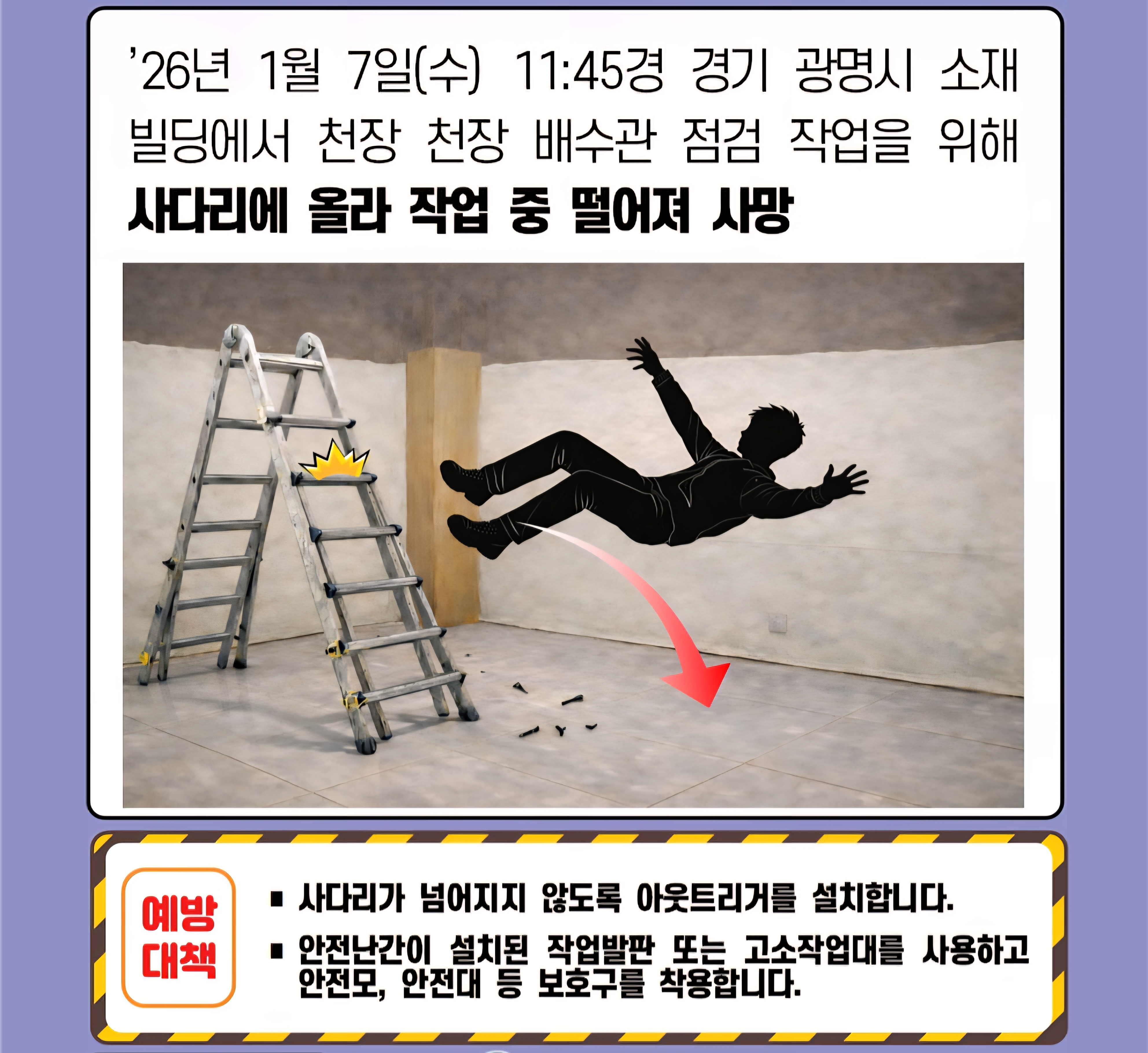 '26년 1월 7일(수) 11:45경 경기 광명시 소재 빌딩에서 천장 천장 배수관 점검 작업을 위해 사다리에 올라 작업 중 떨어져 사망