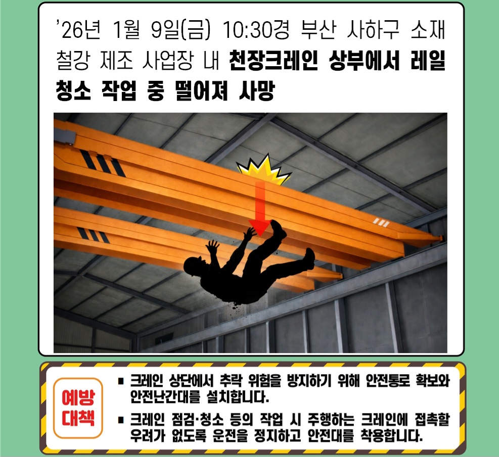 ○ 사고경위 : 철강 제조 사업장 내 천장크레인 상부에서 레일 청소 및 점검 중 9m 아래로 떨어져 크게다쳐 곧바로 병원으로 후송됐으나 치료 중 사망