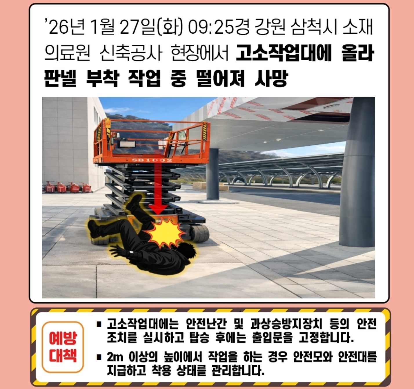 ○ 사고경위 : 삼척의료원 신축공사 현장에서, 캐노피 금속판넬 취부작업을 진행할 예정이었던 근로자가 고소작업대 탑승 후 승강하려는 순간 개방된 출입문으로 떨어져(H= 약 1.1m) 병원으로 이송되었으나 사망