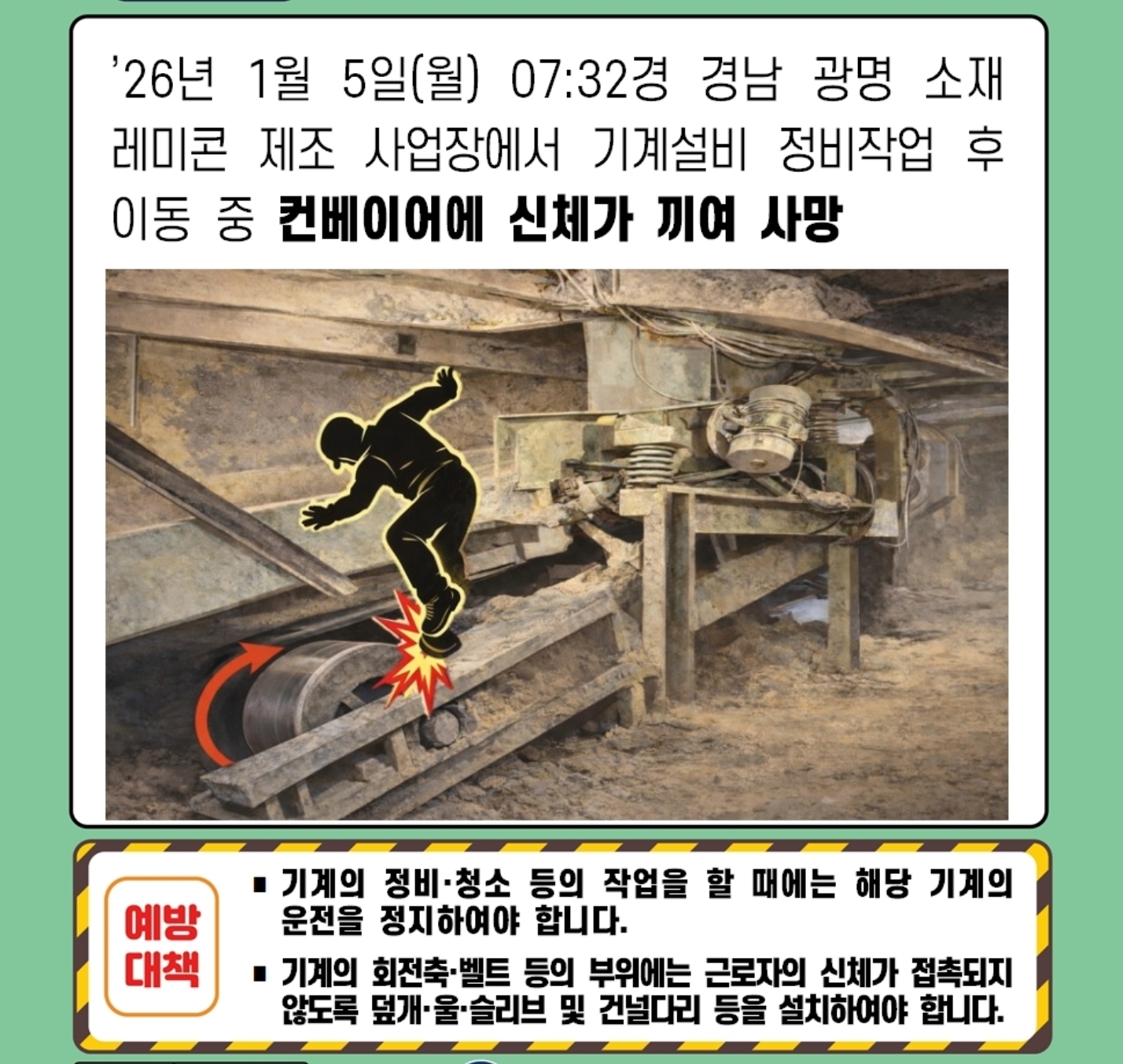 ○ 사고경위 : 레미콘 제조업체 컨베이어 벨트 위에서 기계설비 정비 작업을 하고 내려오던 중 발을 헛디디며 가동 중인 컨베이어 벨트에 신체가 끼여 사망