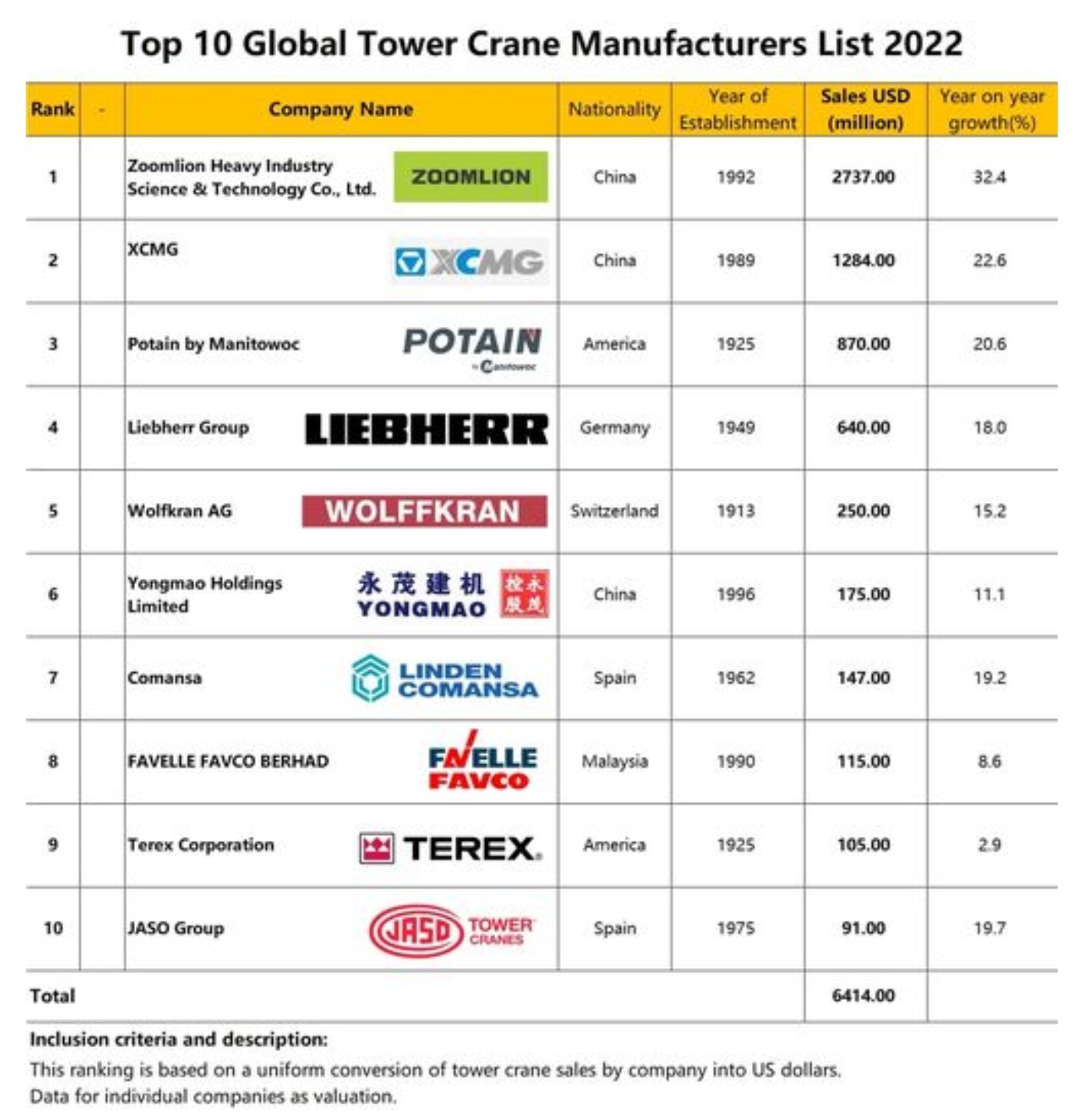 Manitowoc Cranes, the only U.S. crane manufacturer in the top 10 list has retained its position as the third largest tower crane maker in the world despite its sales shrinking to $0.87 billion in 2022.
